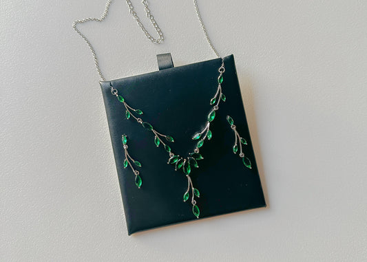 Green Leaf Shape Bridal Jewelry Set For Bride, Emerald Green CZ Dainty Necklace and Earrings Set, Platinum Plated Statement Necklace Set